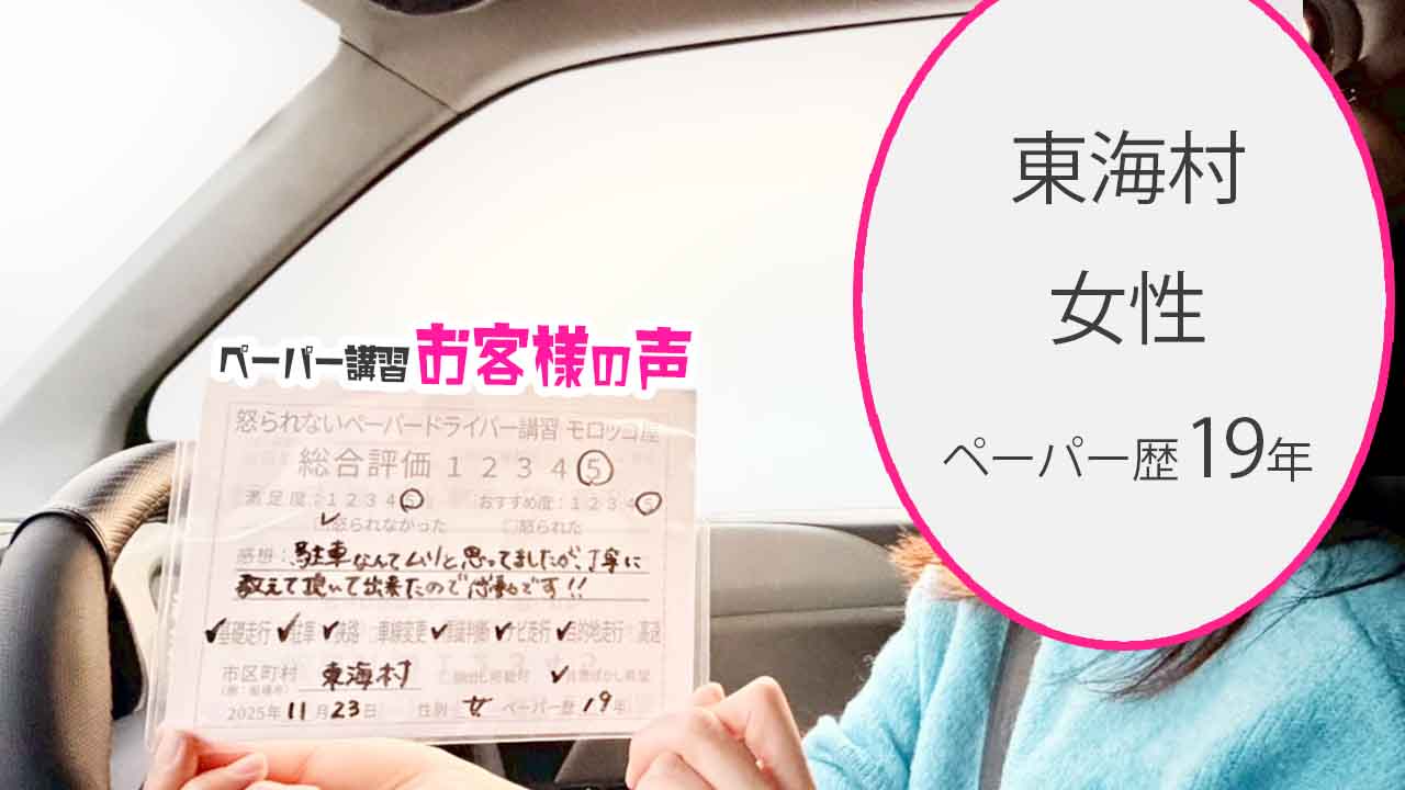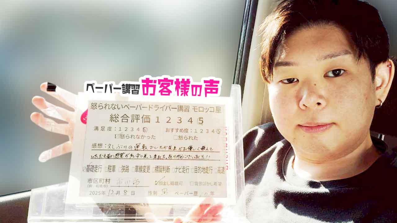 感想:ペーパードライバーになった理由の1つに運転が恐いという気持ちがあったけど、今回基礎からていねいに教えてもらえて、運転が楽しく感じられました。とても良かったです。ひきつづきおねがいしたいです。